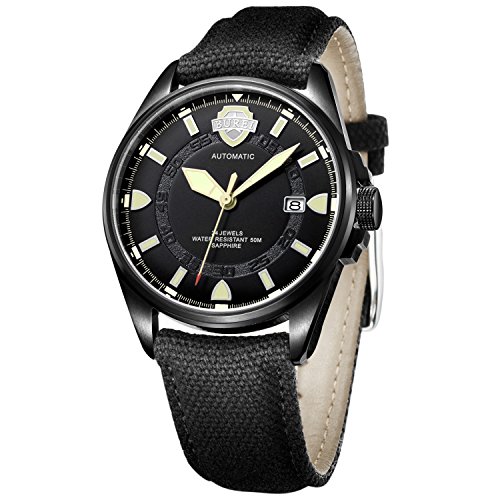 Best Seller! BUREI Men's Luminous Automatic Watch with Black Date Analogue Sapphire Crystal Glass and Canvas Fabric Strap Review