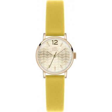 This ladies Orla Kiely Frankie watch has a PVD rose plating PVD rose plating case and is fitted with a quartz movement. It fastens a yellow leather strap and has a silver dial.