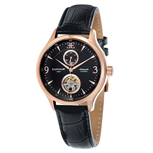 Flinders automatic 42 mm watch with Rose Gold plated stainless steel case black dial and black leather strap The Flinders 42mm timepiece from Thomas Earnshaw watches has an accurate 23 jewels automatic movement with a 24 hour indicator, a cut out sub dial and exhibition case back to view the wheels and cogs as they tick along seamlessly. This version the ES-8023-04 has a layered black dial a horizontal pattern, elevated rose gold numbers, indices and hands all enclosed in a IPRG rose gold plated solid stainless steel round case with a black leather strap and matching attachments. Popular with all ages this watch will meet and exceed all your requirements and is great to wear for all occasions.